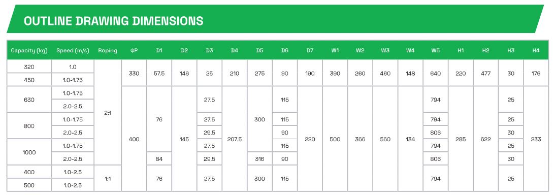 Tải trọng 450kg, tốc độ 1.5m/s, công suất 4.5kw, đường kính 330mm, sử dụng 4-Φ8-12